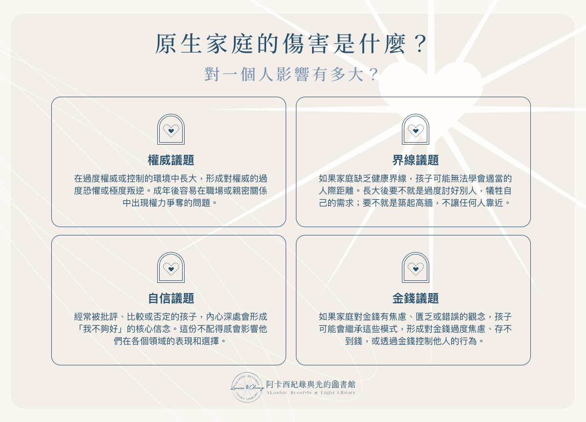 原生家庭的傷害不只是童年的記憶,而是深深烙印在潛意識裡,影響著我們的自信、界線、金錢觀,甚至整個人生的選擇。
